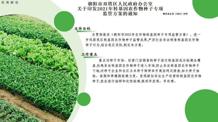 (图解版)(朝双政办发〔2021〕29号) 《朝阳市双塔区人民政府办公室关于印发2021年转基因农作物种子专项监管方案的通知》文件解读